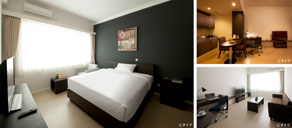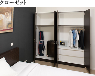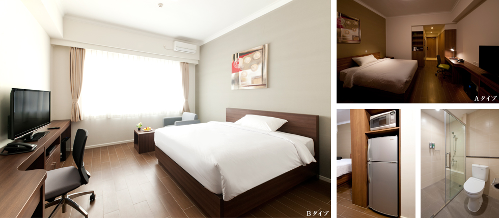 中長期滞在のお客様にもご満足いただけるよう、クイーンサイズ(幅1,600mm)のベッドを採用。その他、大型液晶テレビなど、滞在生活を快適にする設備を備えています。