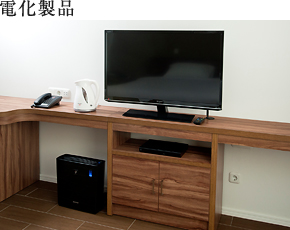 ![]() すべてのお部屋に大型液晶テレビ(CATV視聴可)、DVDプレイヤー、冷蔵庫、電子レンジ、空気清浄機といった電化製品を設置。機能美と安心感、使い勝手を備えた日本ブランドを採用することにより、日本と変わらない快適な日常生活をご提供します。 |